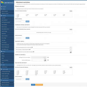 Jei prie laiško yra prisegtas failas, su draudžiamu plėtiniu (galūne), jis bus automatiškai blokuotas. Paprastai ši taisyklė skirta apsaugoti nuo vykdomųjų failų, galimai užkrėstų virusais, gavimo. Standartinis rinkinys atitinka dažniausiai pasitaikančius failus, tačiau jei reikia - jį papildysite skirsnyje spustelėdami "Add new extension" įvedant naują failo galūnę.