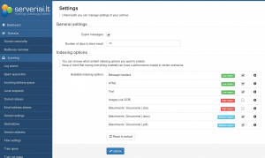 Archyvavimo nustatymai. Galite nurodyti, kiek dienų laiškai bus filtruojami bei koks laiško turinys bus archyvuojamas.