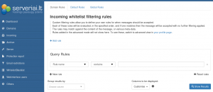Galite įvesti konkrečias taisykles, kuriomis vadovausis filtras praleidžiant laiškus. Tai gali būti žodis, kuris bus aptinkamas laiške, žodžio pabaiga ir pan.