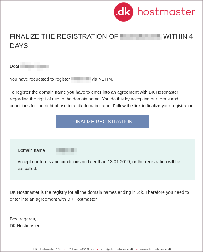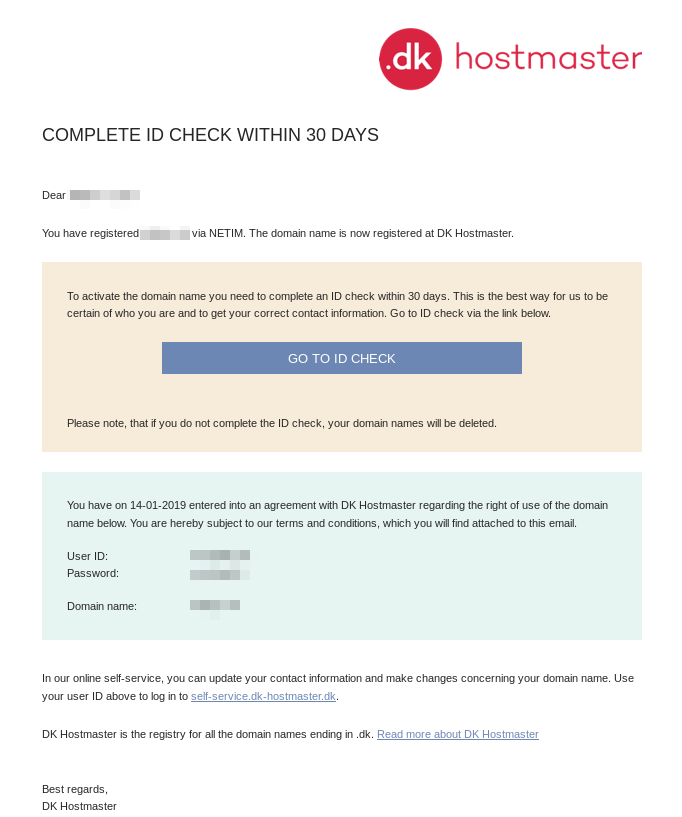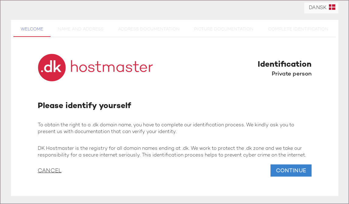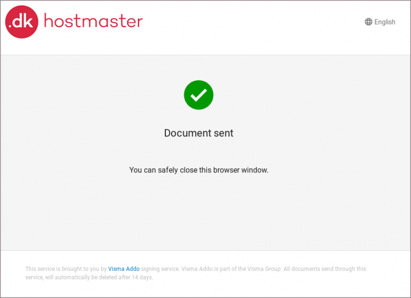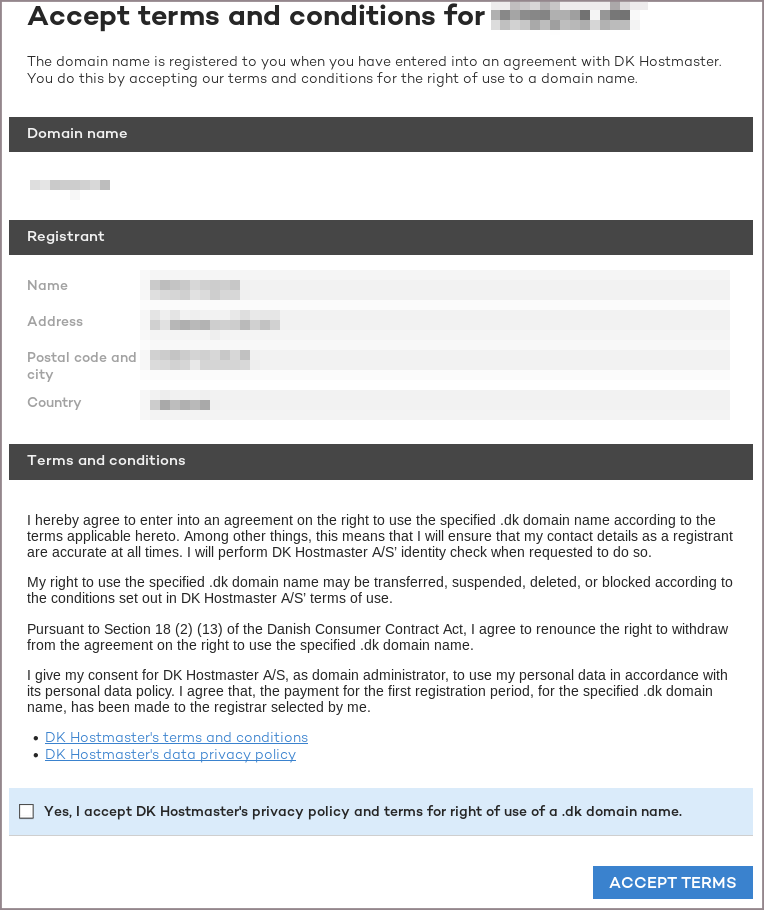 Užsakovui patvirtinus domeno registraciją, domenas yra užregistruojamas. Po to klientui dar reikia prisijungti prie .DK domenų registro sistemos ir patvirtinti savo duomenis. Prisijungimo duomenys ir nuoroda į sistemą yra išsiunčiami el. paštu.
