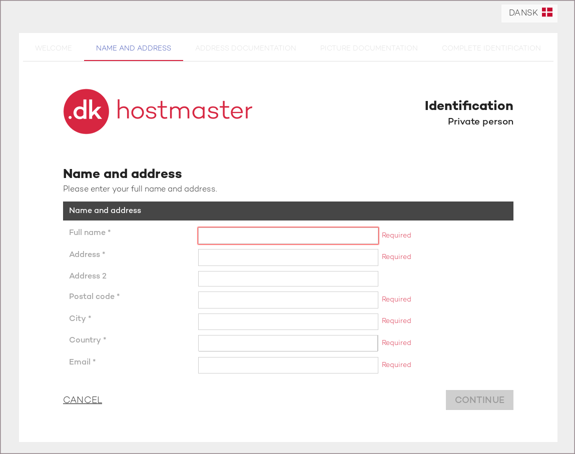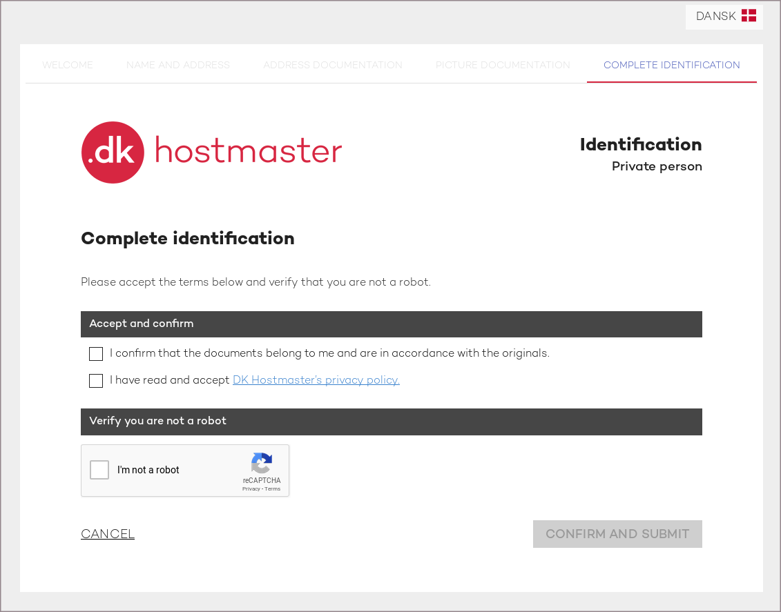Danijos centrinis registras neturi specifinių reikalavimų, kas gali registruoti .DK domenus, tačiau, norėdami užregistruoti tokį domeną, po apmokėjimo dar privalėsite patvirtinti domeno registraciją. Tai atliekama paspaudus atsiųstą nuorodą laiške, kuris yra išsiunčiamas į el. paštą, nurodytą domeno registracijos metu.